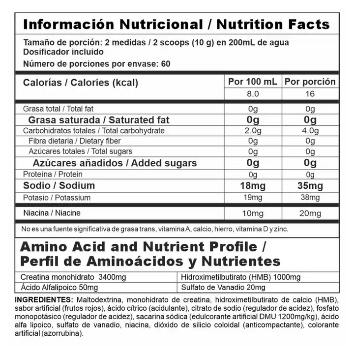 El HMB contenido en Crea Stack (1g por porción), es el 100% de la dosis recomendada de HMB por ingesta y es otro de los ingredientes aprobados y con mayor cantidad de estudios sobre sus efectos en la masa muscular.