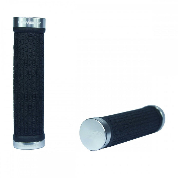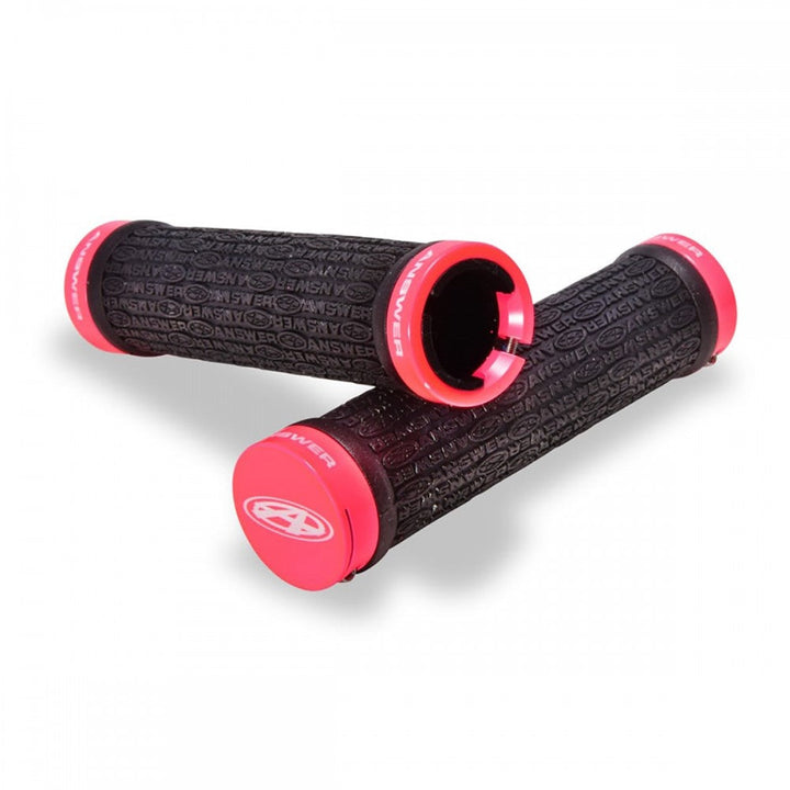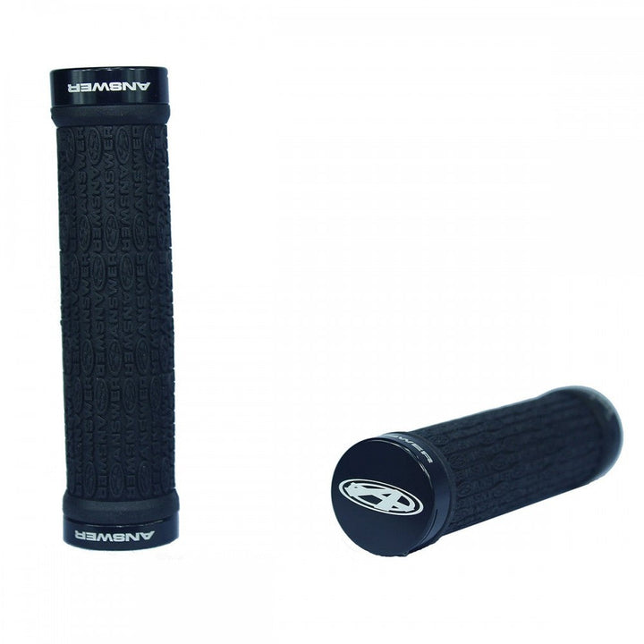 Los Mangos Answer están moldeados a partir de un compuesto de goma suave con un patrón repetido del logotipo de Answer para mayor comodidad y control. Los anillos de bloqueo de aluminio cuentan con logotipos de Answer grabados con láser y ayudan a mantener los agarres en un solo lugar mientras facilitan la instalación y extracción.